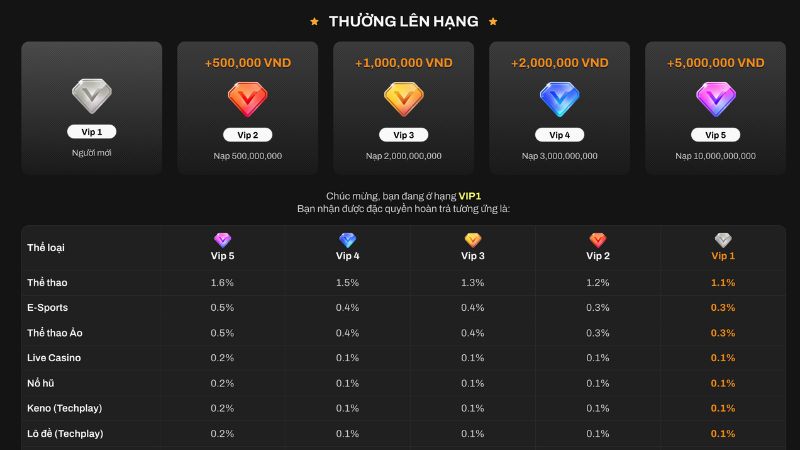- Khi đã lên đến VIP 5 trở lên, giá trị thưởng có thể lên đến hàng triệu đồng. Kèm theo các quyền lợi vượt trội như ưu tiên rút tiền, hỗ trợ riêng 1:1, tỷ lệ hoàn trả cao hơn, và giới hạn nạp/rút linh hoạt.